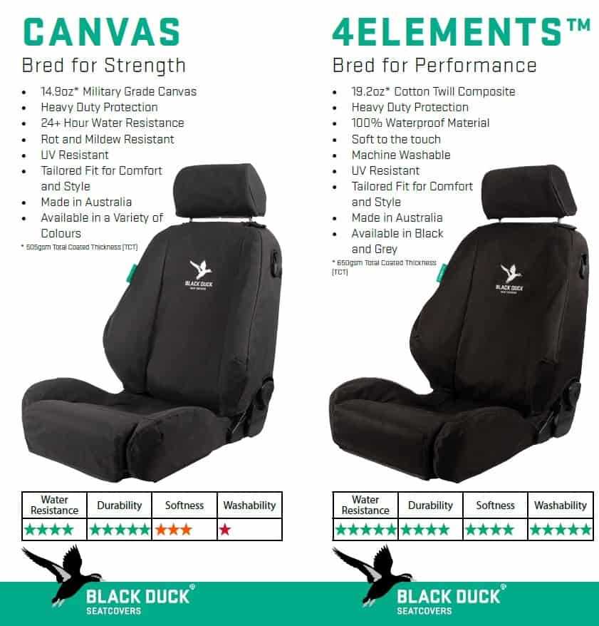 4Elements® by Black Duck® SeatCovers is tested to withstand tough conditions without compromising on comfort. Featuring a 19.2oz Cotton Twill Composite, this is a heavyweight product with a soft and flexible feel for the ultimate in seat protection.